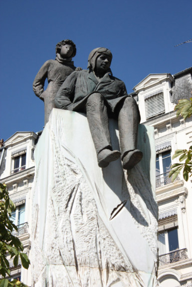 Place Bellecour, un groupe statuaire dù à Christiane Guillaubey représente le Petit Prince debout posant la main sur l’épaule d’Antoine de Saint-Exupéry assis en haut d’une stèle de 5,5 m de haut.