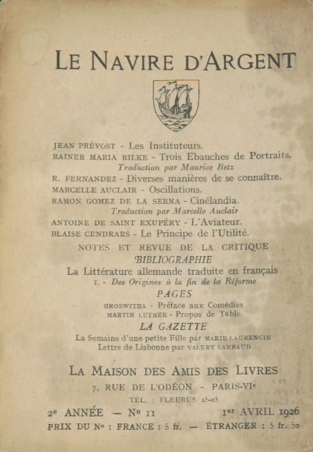 Dans le salon de sa parente Yvonne de Lestrange, il côtoie les écrivains les plus illustres et rencontre Jean Prévost. Il est critique littéraire à la Nouvelle Revue Française dont André Gide, Gaston Gallimard et Jean Schlumberger, les principales figures de la revue,fréquentent aussi le salon. Enthousiasmé par ses expériences de pilotage, Saint-Exupéry captive Prévost par le récit de ses aventures dans les airs. Il lui parle de L’Évasion de Jacques Bernis dont il remet les feuillets à Prévost curieux de les lire. Les rédacteurs de la N. R. F. décident de confier le texte à une autre revue à laquelle ils sont liés et dont Jean Prévost est secrétaire de rédaction : Le Navire d’argent. La revue littérature en publie un extrait en avril 1926, sous le titre L’Aviateur.
